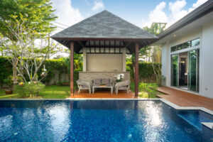 swimming pool and pavilion with green garden